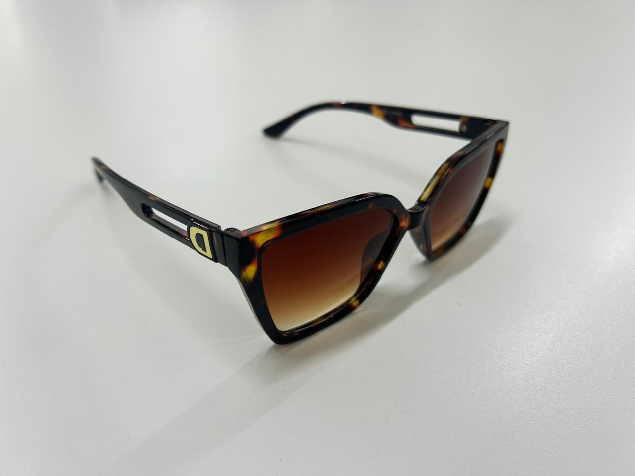 Combine elegância clássica e modernidade com estes óculos de sol de inspiração cat-eye. A armação apresenta o icónico padrão tartaruga (tortoise) em tons terrosos, que harmoniza perfeitamente com as lentes degradê em tons de castanho, oferecendo um visual quente e sofisticado. As hastes possuem um design vazado exclusivo com um detalhe metálico dourado em forma de "D", conferindo um toque de luxo discreto à peça. Este acessório sem marca é a escolha ideal para quem procura a estética das grandes passarelas com conforto e versatilidade. Sinta-se pronta para qualquer ocasião com o glamour inconfundível que remete ao universo da Victoria's Secret.
